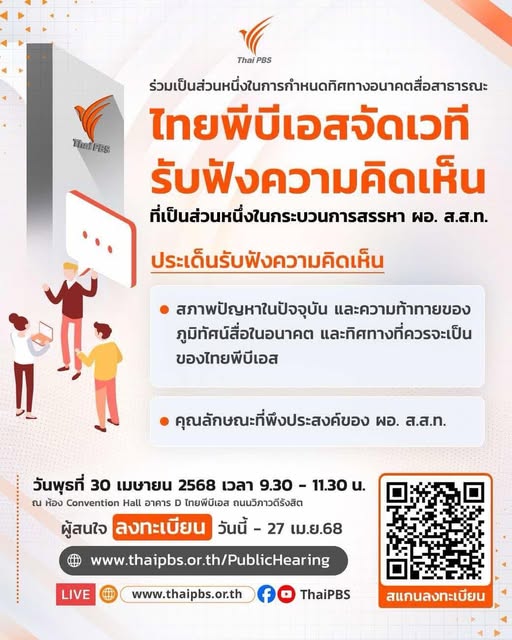 ลงทะเบียนเข้าร่วมงาน ภายในวันที่ 27 เมษายน 2568 ทาง www.thaipbs.or.th/PublicHearing