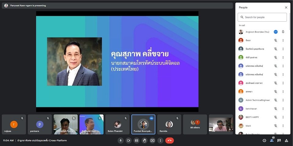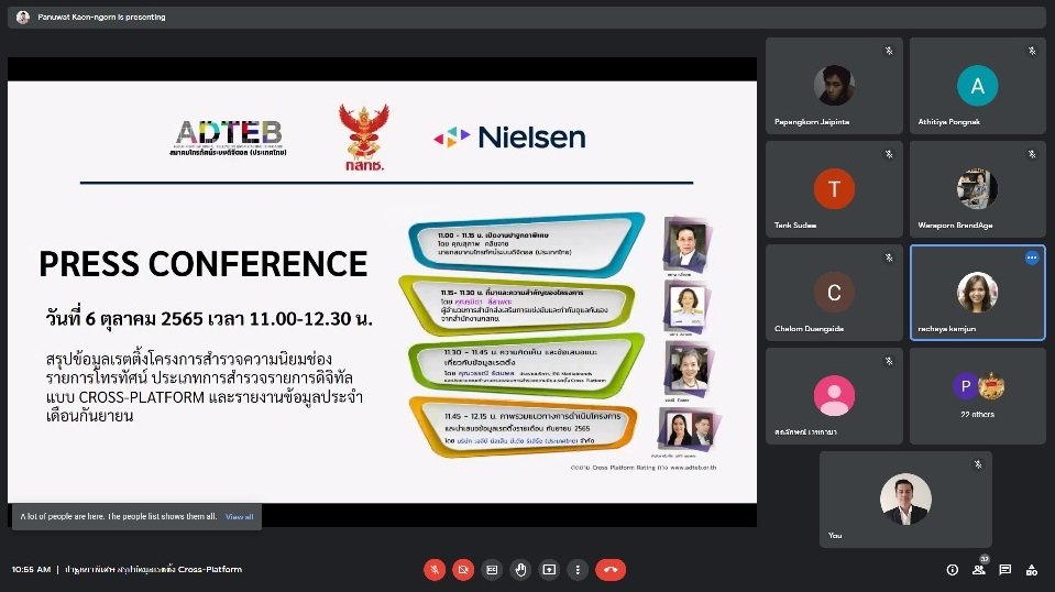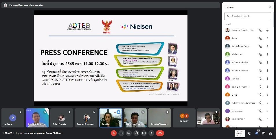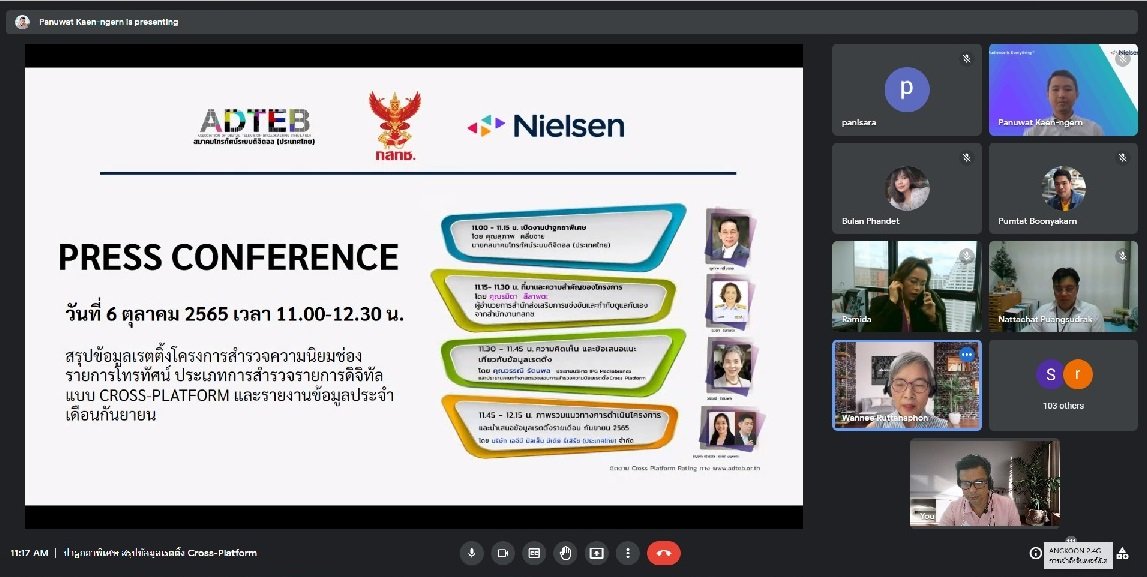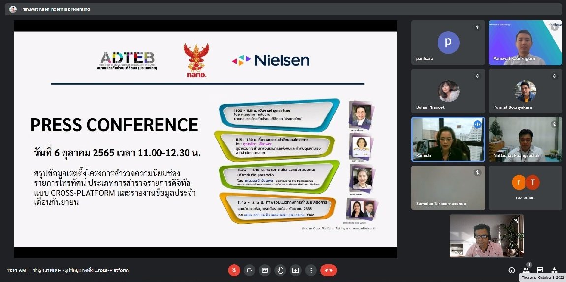 สมาคมโทรทัศน์ระบบดิจิตอล (ประเทศไทย) ร่วมกับ บริษัท เอจีบี นีลเส็น มีเดีย รีเสิร์ช (ประเทศไทย) จำกัด และ สำนักงานกสทช. สรุปข้อมูลเรตติ้งโครงการสำรวจความนิยมช่องรายการโทรทัศน์ประเภทการสำรวจรายการดิจิทัลแบบ CROSS PLATFORM และรายงานข้อมูลประจำเดือนกันยายน ผ่านระบบ Google Meet  ซึ่งมีผู้เข้าร่วมประชุมที่เป็นตัวแทนจากสมาคมโทรทัศน์ระบบดิจิตอล (ประเทศไทย) ผู้ประกอบกิจการโทรทัศน์ภาคพื้นดินในระบบดิจิทัล ประเภทธุรกิจ และสถานีโทรทัศน์ภาคพื้นดินในระะบบดิจิทัล ประเภทสาธารณะ มีเดียเอเจนซี่ ผู้ที่สนใจ ตัวแทนจากสถาบันศึกษา หน่วยงานภาครัฐ ฯลฯ