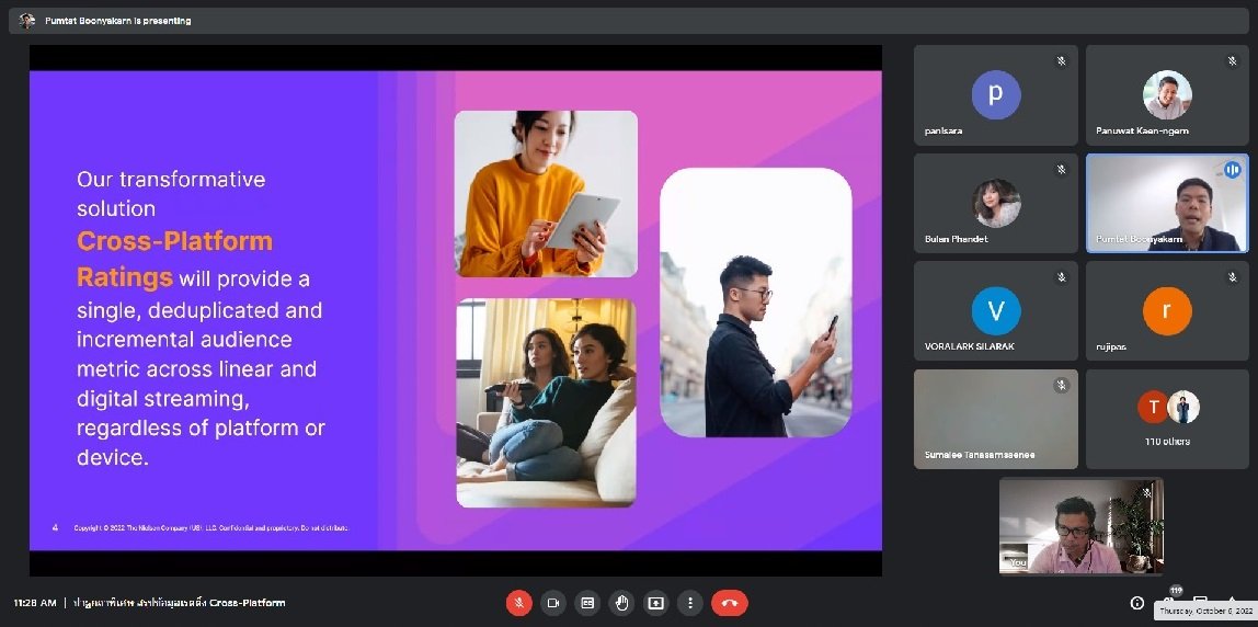 คุณภูมิทัศน์  บุญยการ จากบริษัท เอจีบี นีลเส็น มีเดีย รีเสิร์ช (ประเทศไทย) จำกัด ให้ข้อมูลว่า ข้อมูลเรตติ้งข้ามแพลตฟอร์มแบบเต็มรูปแบบนี้ ครอบคลุมข้อมูลจากทั้งกลุ่มตัวอย่างและการขยายกลุ่มตัวอย่างจำลองจากเทคโนโลยีการเก็บข้อมูล Census จะส่งมอบในไตรมาสที่ 1 ของปี 2566 หลังจากช่วงเดือนสิงหาคมที่ผ่านมา ได้เริ่มส่งมอบข้อมูลการรับชมจากกลุ่มตัวอย่างรับชมผ่านโทรทัศน์และอุปกรณ์ดิจิทัล (คอมพิวเตอร์, แท็บแล็ต, สมาร์ทโฟน) ไปบ้างแล้ว ในส่วนของรายการสด ผ่านทีวีและสตรีมมิ่ง และในไตรมาส 4 ของปี 2565 นี้ จะครอบคลุมเพิ่มเติมการรับชมเนื้อหารายการย้อนหลัง