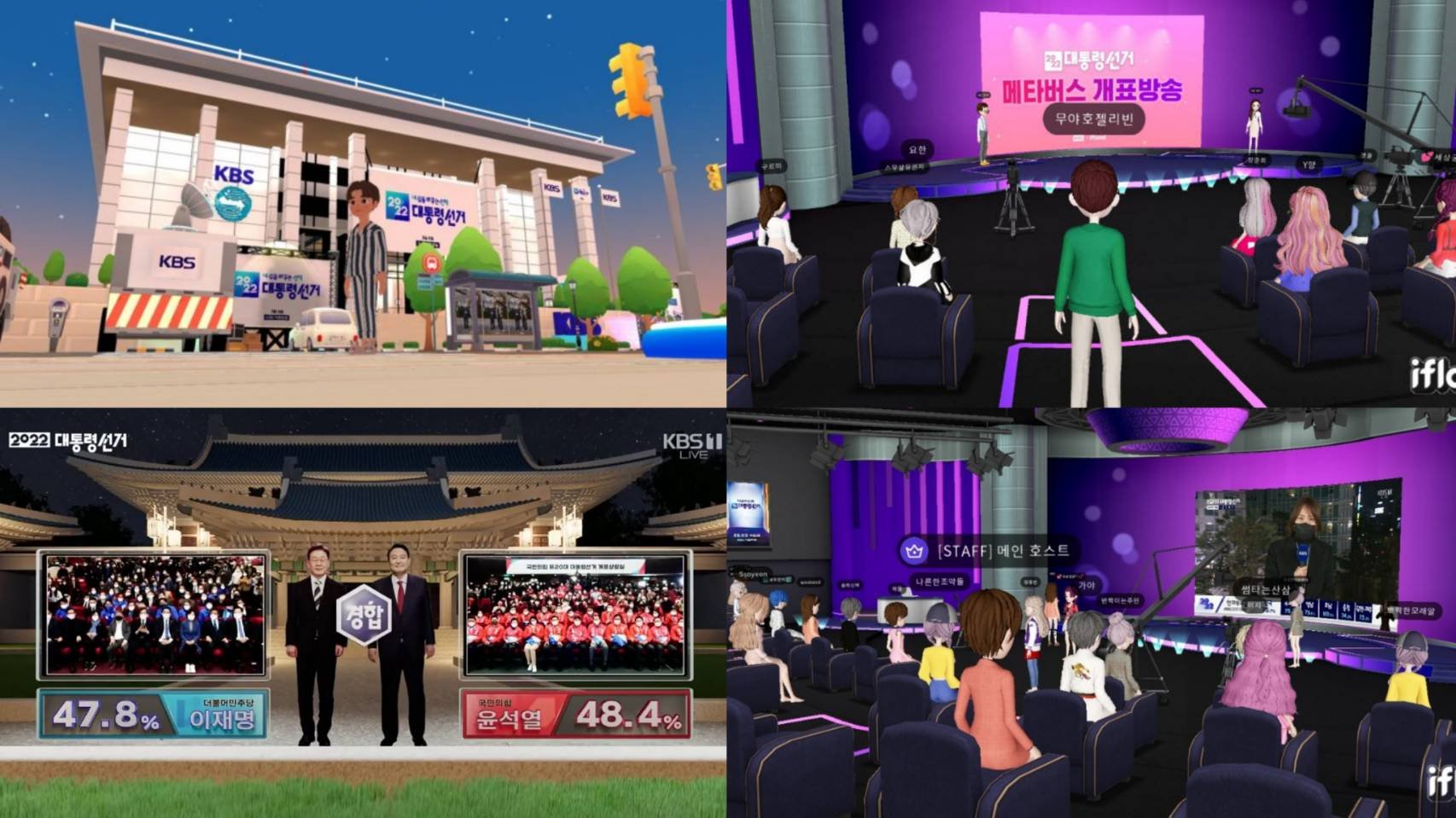 2) สถานีโทรทัศน์ KBS – Korean Broadcasting System ได้ร่วมกับ SK Telecom นำนวัตกรรมความจริงเสมือน Virtual Reality “Ifland” มาใช้ ตลอดจนการสร้างสตูดิโอและแพลตฟอร์มในโลกเมตาเวิร์ส (Metaverse) “Let’s Be Together KBS” ในช่วงการเลือกตั้งประธานาธิบดีเกาหลีใต้ (ไตรมาส 1/2022) เพื่อการนำเสนอข้อมูลข่าวสาร การจัดทำโพลล์ และเป็นช่องทางให้ผู้ชมได้มีส่วนร่วมในโลกเสมือนจริงบนแพลตฟอร์ม ZEPETO ผ่านนวัตกรรม XR – AR – VR (ภาพที่ 10)