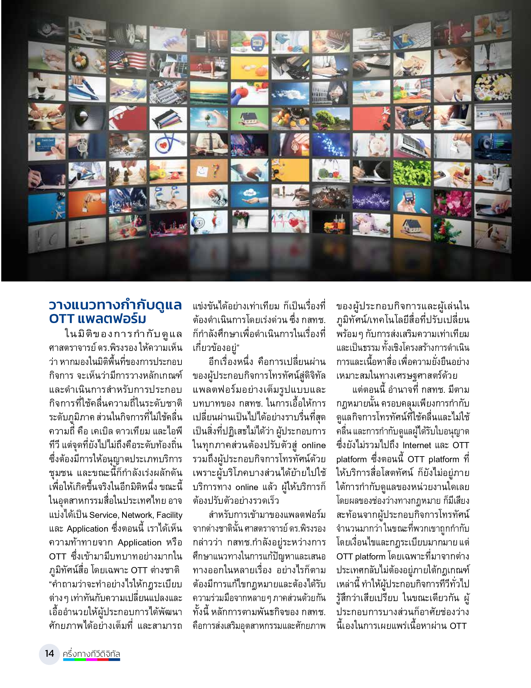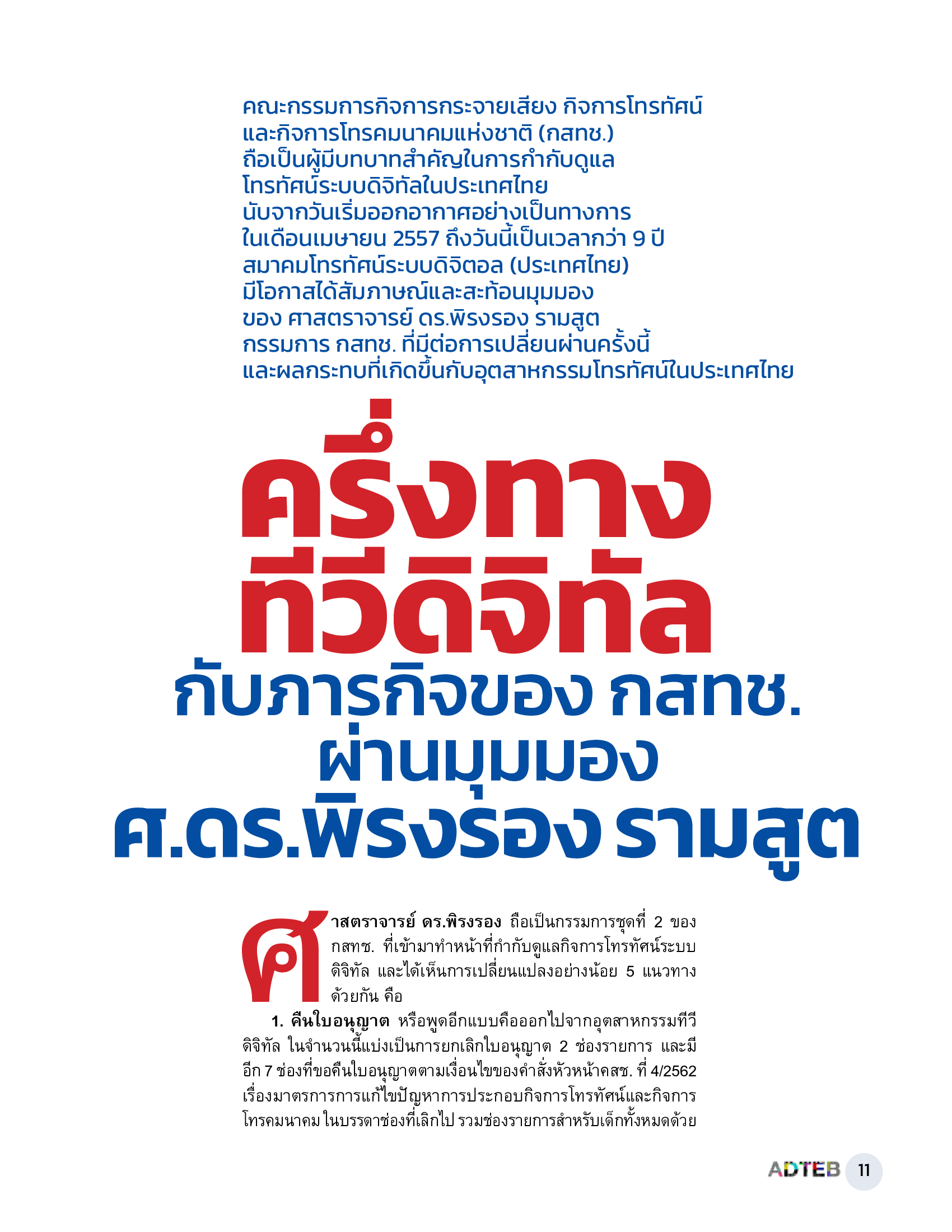 คณะกรรมการกิจการกระจายเสียง กิจการโทรทัศน์ และกิจการโทรคมนาคมแห่งชาติ (กสทช.) ถือเป็นผู้มีบทบาทสำคัญในการกำกับดูแลโทรทัศน์ระบบดิจิทัลในประเทศไทย นับจากวันเริ่มออกอากาศอย่างเป็นทางการในเดือนพฤษภาคม 2557 ถึงวันนี้เป็นเวลากว่า 9 ปี สมาคมโทรทัศน์ระบบดิจิตอล (ประเทศไทย) มีโอกาสได้สัมภาษณ์และสะท้อนมุมมองของ ศาสตราจารย์ ดร.พิรงรอง รามสูต กรรมการ กสทช. ที่มีต่อการเปลี่ยนผ่านครั้งนี้ และผลกระทบที่เกิดขึ้นกับอุตสาหกรรมโทรทัศน์ในประเทศไทย