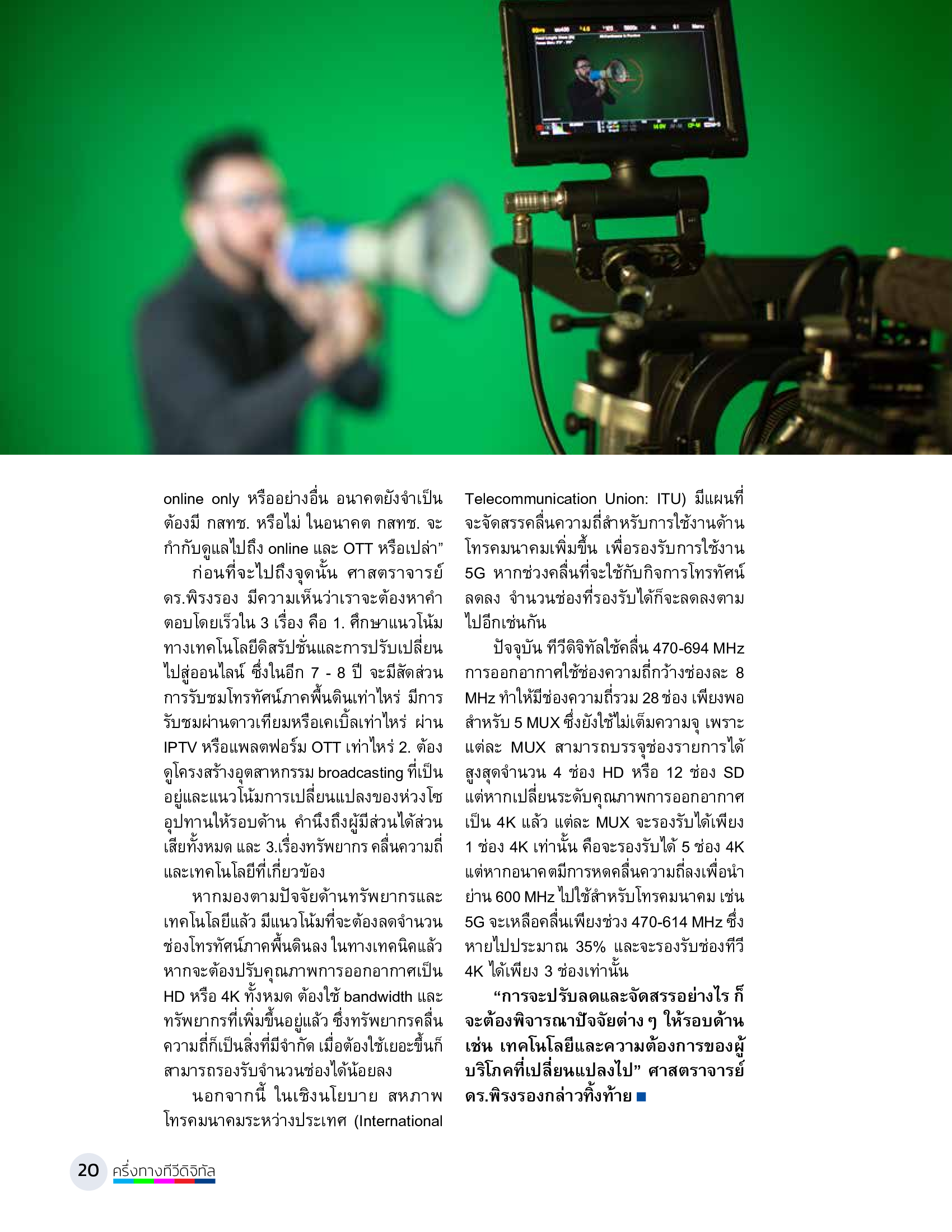 สำหรับการดำรงอยู่ของโทรทัศน์ภาคพื้นดิน (linear TV) ในฐานะโครงสร้างพื้นฐานด้านการสื่อสารในระดับสาธารณะ คุณค่าและความหลากหลายของเนื้อหาที่โดดเด่นในเชิงคุณค่าและแตกต่างจากเนื้อหาโสตทัศน์ (audio-visual) บนแพลตฟอร์มอื่น การนำเสนอเนื้อหาเพื่อผู้รับสารโดยทั่วไปหรือเฉพาะกลุ่ม และการปรับตัวในทุกมิติของผู้ประกอบการและนักวิชาชีพ