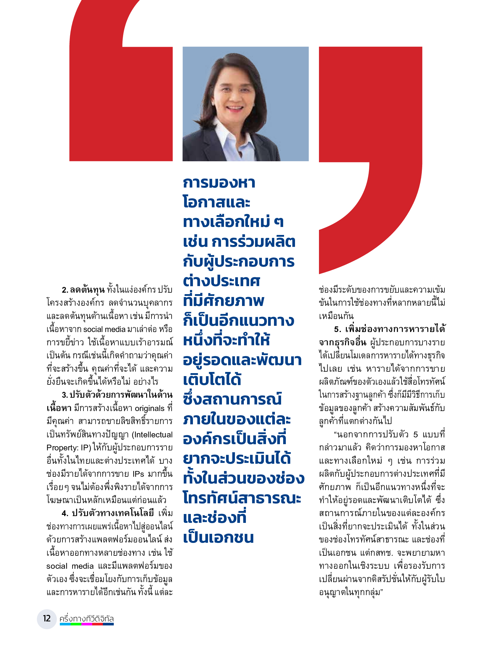 “นอกจากการปรับตัว 5 แบบที่กล่าวมาแล้ว คิดว่าการมองหาโอกาสและทางเลือกใหม่ ๆ เช่น การร่วมผลิตกับผู้ประกอบการต่างประเทศที่มีศักยภาพ ก็เป็นอีกแนวทางหนึ่งที่จะทำให้อยู่รอดและพัฒนาเติบโตได้ ซึ่งสถานการณ์ภายในของแต่ละองค์กรเป็นสิ่งที่ยากจะประเมินได้ ทั้งในส่วนของช่องโทรทัศน์สาธารณะ และช่องที่เป็นเอกชน แต่กสทช. จะพยายามหาทางออกในเชิงระบบ เพื่อรองรับการเปลี่ยนผ่านจากดิสรัปชั่นให้กับผู้รับใบอนุญาตในทุกกลุ่ม”