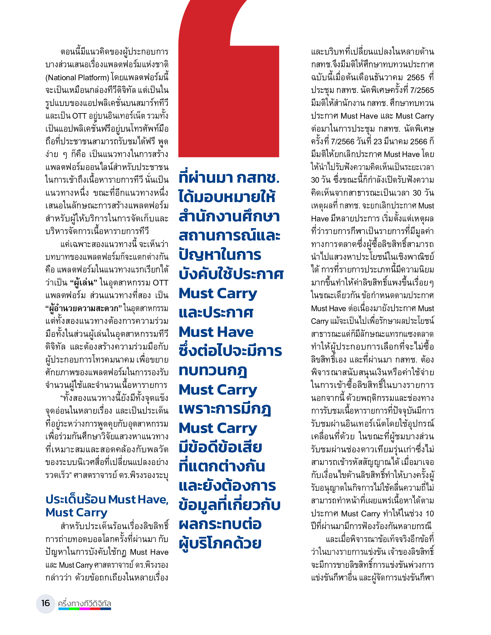 ที่ผ่านมา กสทช. ได้มอบหมายให้สำนักงานศึกษาสถานการณ์และปัญหาในการบังคับใช้ประกาศ Must Carry และ ประกาศ Must Have ซึ่งต่อไปจะมีการทบทวนกฎ Must Carry เพราะการมีกฎ Must Carry มีข้อดีข้อเสียที่แตกต่างกัน และยังต้องการข้อมูลที่เกี่ยวกับผลกระทบต่อผู้บริโภคด้วย ทั้งนี้ ได้มอบหมายให้สำนักงาน กสทช. จัดทำแบบสอบถามการศึกษาผลกระทบต่อผู้บริโภคในการปรับปรุงประกาศ Must Carry ในอุตสาหกรรมทีวีดิจิทัล ผลการสำรวจนี้น่าจะเป็นส่วนหนึ่งของข้อมูลในการประกอบการพิจารณาของ กสทช. ในอนาคต