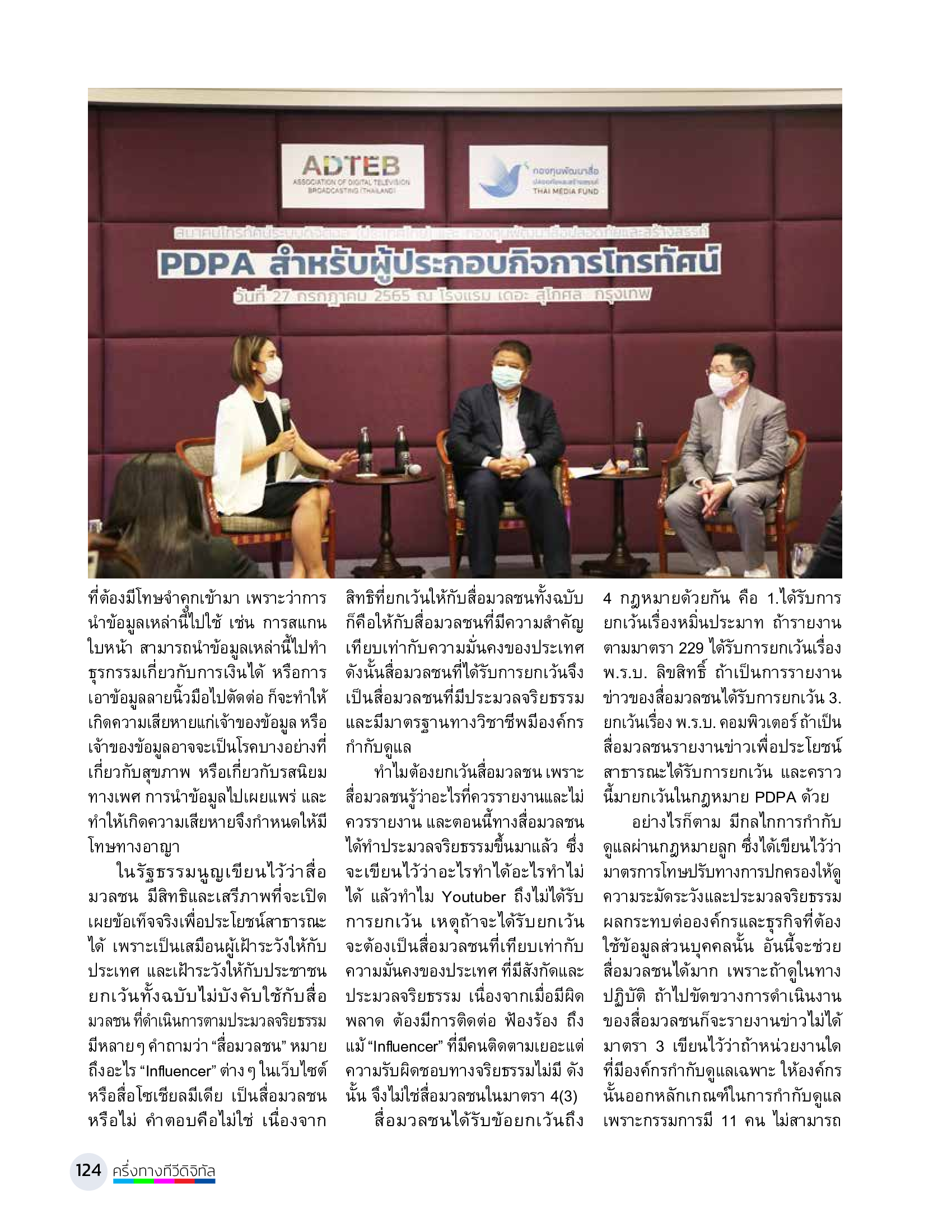 กฎหมาย PDPA มีอำนาจครอบคลุมไปถึงหน่วยงาน องค์กรต่างๆ รวมถึงผู้ประกอบกิจการโทรทัศน์ ช่องต่างๆ ที่ยังคงเกิดความสงสัย ว่าสิ่งใดกระทำได้ สิ่งใดกระทำไม่ได้ จึงเป็นที่มาให้สมาคมโทรทัศน์ระบบดิจิตอล (ประเทศไทย) ได้ร่วมกับกองทุนพัฒนาสื่อปลอดภัยและสร้างสรรค์ ได้ จัดอบรมเกี่ยวกับเรื่อง PDPA สำหรับผู้ประกอบกิจการโทรทัศน์ โดยเฉพาะ โดยมีผู้เชี่ยวชาญที่คร่ำหวอดในวงการกฎหมายดิจิทัล เช่น นายไพบูลย์ อมรภิญโญเกียรติ และผู้เชียวชาญด้านสื่อสารมวลชน นายชวรงค์ ลิมป์ปัทมปาณี ให้ความรู้และเสนอทางออกแก่ผู้มีวิชาชีพประกอบกิจการโทรทัศน์ และผู้ประกอบกิจการโทรทัศน์ไว้อย่างน่าสนใจ