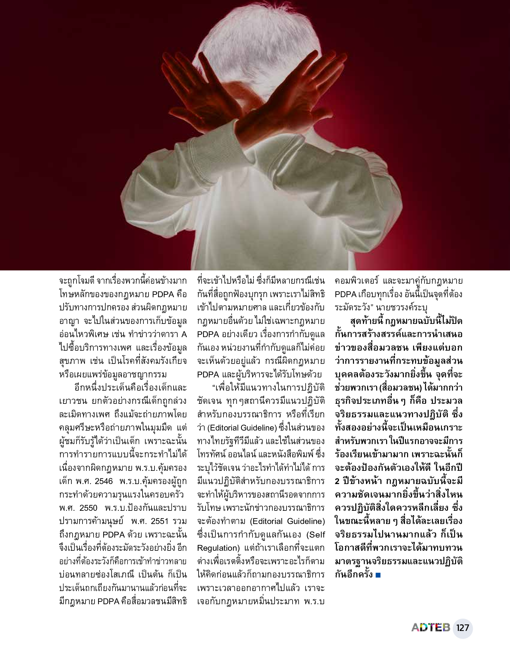 สุดท้ายนี้ กฎหมายฉบับนี้ไม่ปิดกั้นการสร้างสรรค์และการนำเสนอข่าวของสื่อมวลชน เพียงแต่บอกว่าการรายงานที่กระทบข้อมูลส่วนบุคคลต้องระวังมากยิ่งขึ้น จุดที่จะช่วยพวกเรา (สื่อมวลชน) ได้มากกว่าธุรกิจประเภทอื่นๆ ก็คือ ประมวลจริยธรรมและแนวทางปฎิบัติ ซึ่งทั้งสองอย่างนี้จะเป็นเหมือนเกราะสำหรับพวกเรา ในปีแรกอาจจะมีการร้องเรียนเข้ามามาก เพราะฉะนั้นก็จะต้องป้องกันตัวเองให้ดี ในอีกปี 2 ปีข้างหน้า กฎหมายฉบับนี้จะมีความชัดเจนมากยิ่งขึ้นว่าสิ่งไหนควรปฏิบัติสิ่งใดควรหลีกเลี่ยง ซึ่งในขณะนี้หลายๆ สื่อได้ละเลยเรื่องจริยธรรมไปนานมากแล้ว ก็เป็นโอกาสดีที่พวกเราจะได้มาทบทวนมาตรฐานจริยธรรมและแนวปฏิบัติกันอีกครั้ง