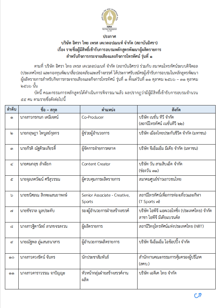 ตามที่ บริษัท อิศรา ไทย เพรส เดเวลอปเมนท์ จำกัด (สถาบันอิศรา) ร่วมกับ สมาคมโทรทัศน์ระบบดิจิตอล (ประเทศไทย) และกองทุนพัฒนาสื่อปลอดภัยและสร้างสรรค์ ได้ประกาศรับสมัครผู้เข้ารับการอบรมในหลักสูตรพัฒนาผู้ผลิตรายการสำหรับกิจการกระจายเสียงและกิจการโทรทัศน์ รุ่นที่ 1 ตั้งแต่วันที่ 11 ตุลาคม 2566 – 31 ตุลาคม 2566 นั้น
