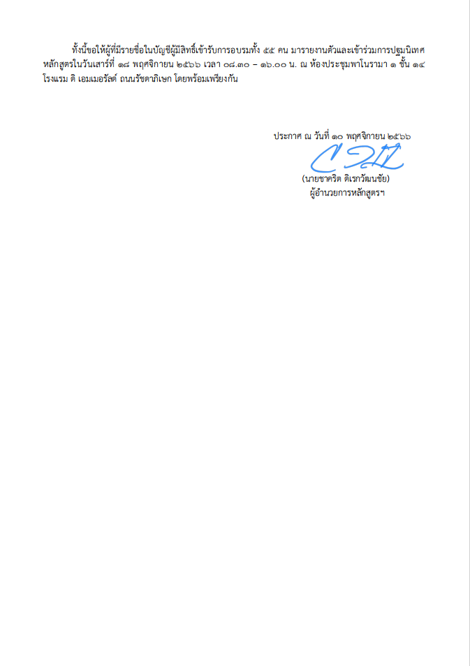 บัดนี้ คณะกรรมการหลักสูตรได้ดำเนินการพิจารณาแล้ว ผลปรากฏว่ามีผู้มีสิทธิ์เข้ารับการอบรมจำนวน 55 คน ตามรายชื่อดังต่อไปนี้