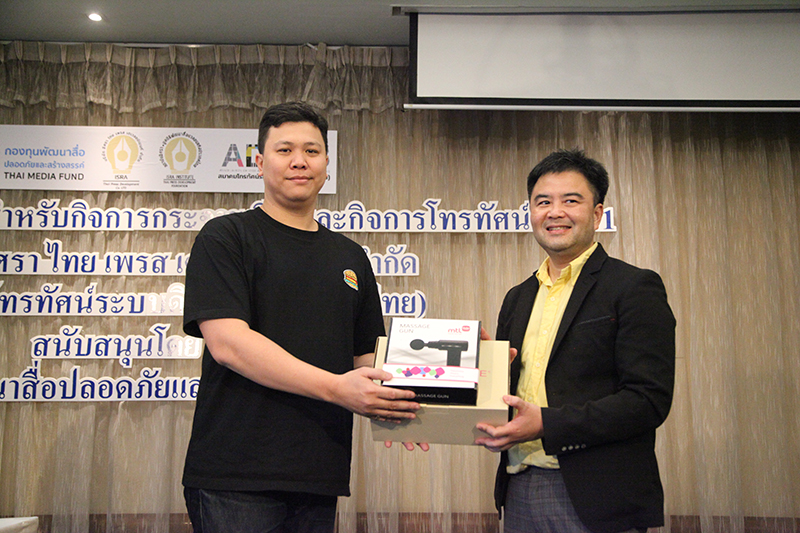 อาจารย์อาทินันทน์ แก้วประจันทร์ ตัวแทนผู้เข้าอบรมหลักสูตรพัฒนาผู้ผลิตรายการสำหรับกิจการกระจายเสียงและกิจการโทรทัศน์ (The Producer) รุ่นที่ 1 ให้การต้อนรับ ดร.ธราภุช จารุวัฒนะ ประธานเจ้าหน้าที่บริหาร บริษัท ไอพีจี มีเดียแบรนด์ (ประเทศไทย) ในโอกาสบรรยาย หัวข้อ พฤติกรรมผู้บริโภคสื่อที่เปลี่ยนแปลงไปและการวิเคราะห์ข้อมูลเรตติ้งเพื่อการผลิตรายการ จัดโดย บริษัท อิศรา ไทย เพรส เดเวลอปเมนท์ จำกัด (สถาบันอิศรา) ร่วมกับ สมาคมโทรทัศน์ระบบดิจิตอล (ประเทศไทย) และกองทุนพัฒนาสื่อปลอดภัยและสร้างสรรค์ โดยมีสมาชิกรุ่นร่วมต้อนรับ เมื่อวันเสาร์ที่ 16 ธันวาคม 2566 ณ ห้องพาโนรามา 1 ชั้น 14 โรงแรม ดิ เอมเมอรัลด์ ถนนรัชดาภิเษก