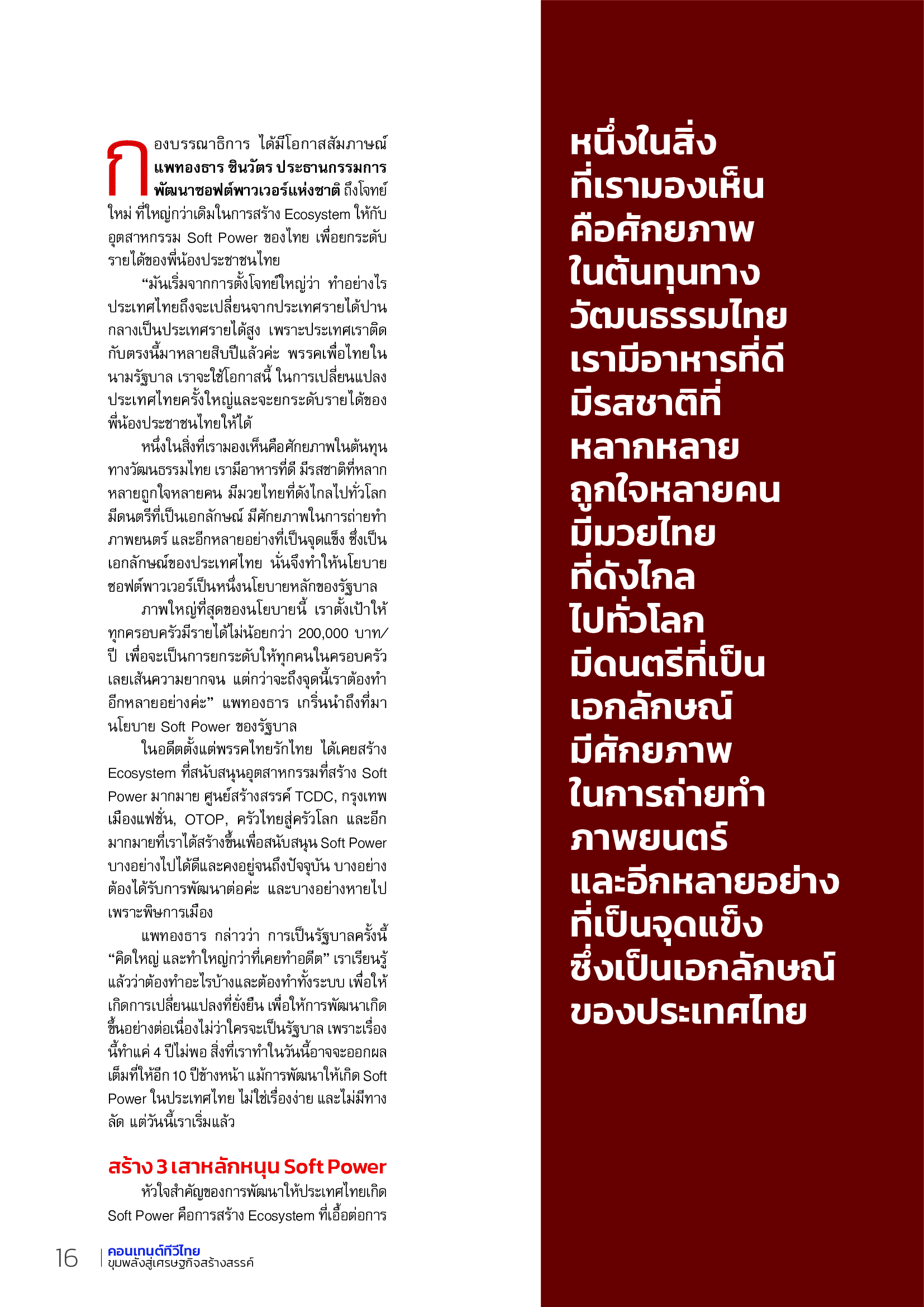 กองบรรณาธิการ ได้มีโอกาสสัมภาษณ์ แพทองธาร ชินวัตร ประธานกรรมการพัฒนาซอฟต์พาวเวอร์แห่งชาติ ถึงโจทย์ใหม่ ที่ใหญ่กว่าเดิมในการสร้าง Ecosystem ให้กับอุตสาหกรรม Soft Power ของไทย เพื่อยกระดับรายได้ของพี่น้องประชาชนไทย