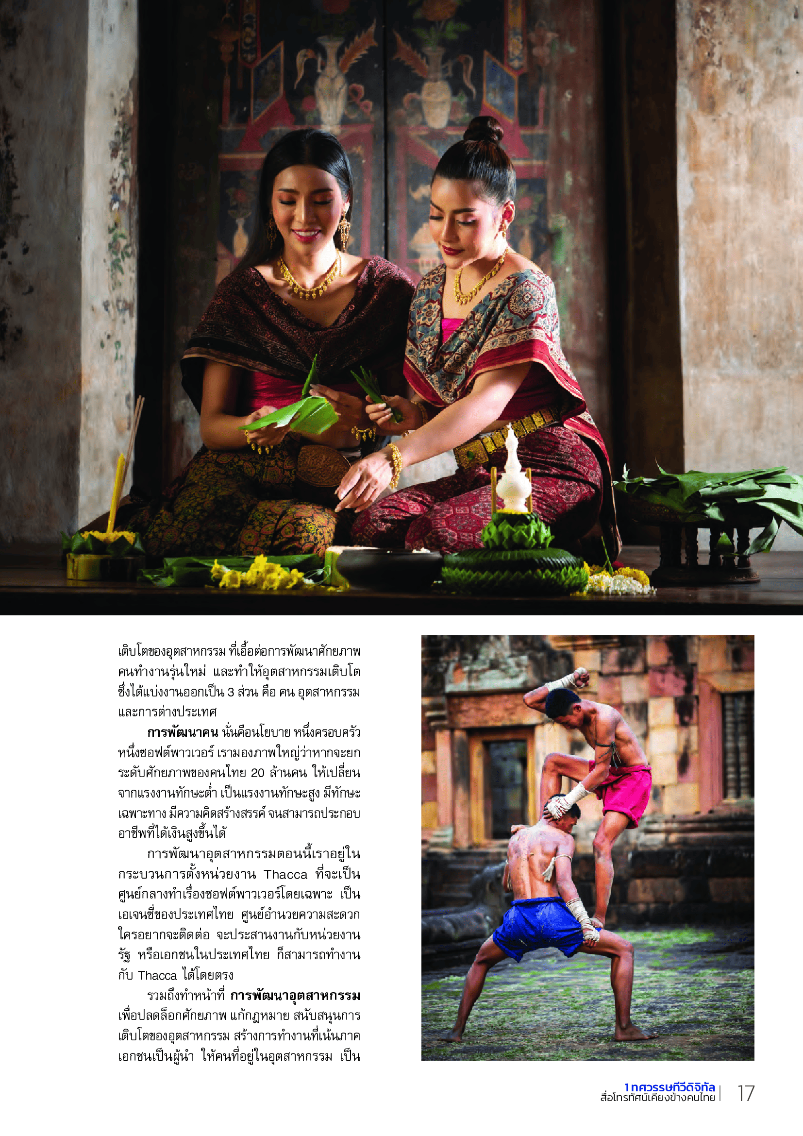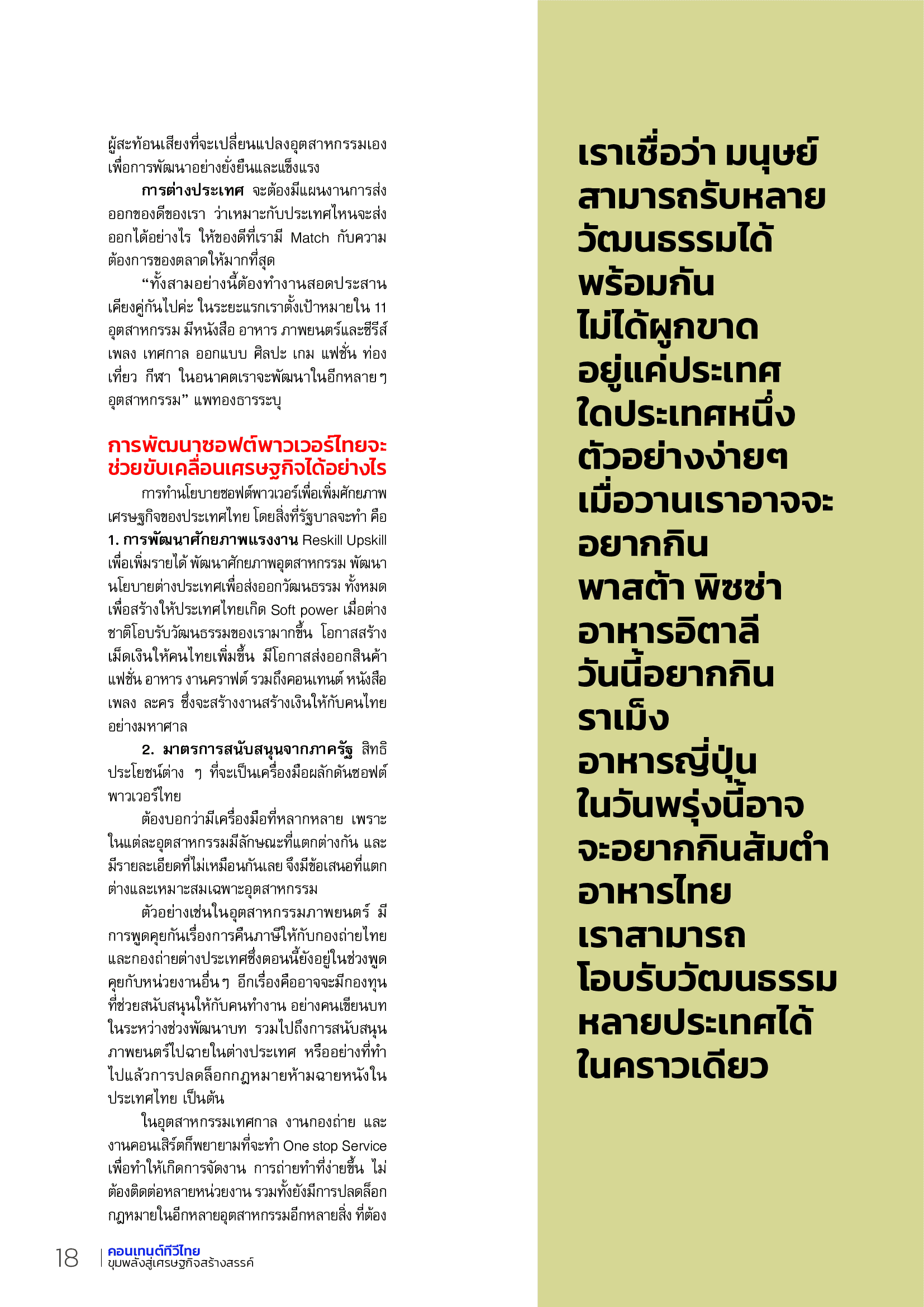 การพัฒนาอุตสาหกรรมตอนนี้เราอยู่ในกระบวนการตั้งหน่วยงาน Thacca ที่จะเป็นศูนย์กลางทำเรื่องซอฟต์พาวเวอร์โดยเฉพาะ เป็นเอเจนซี่ของประเทศไทย ศูนย์อำนวยความสะดวก ใครอยากจะติดต่อ จะประสานงานกับหน่วยงานรัฐ หรือเอกชนในประเทศไทย ก็สามารถทำงานกับ Thacca ได้โดยตรง