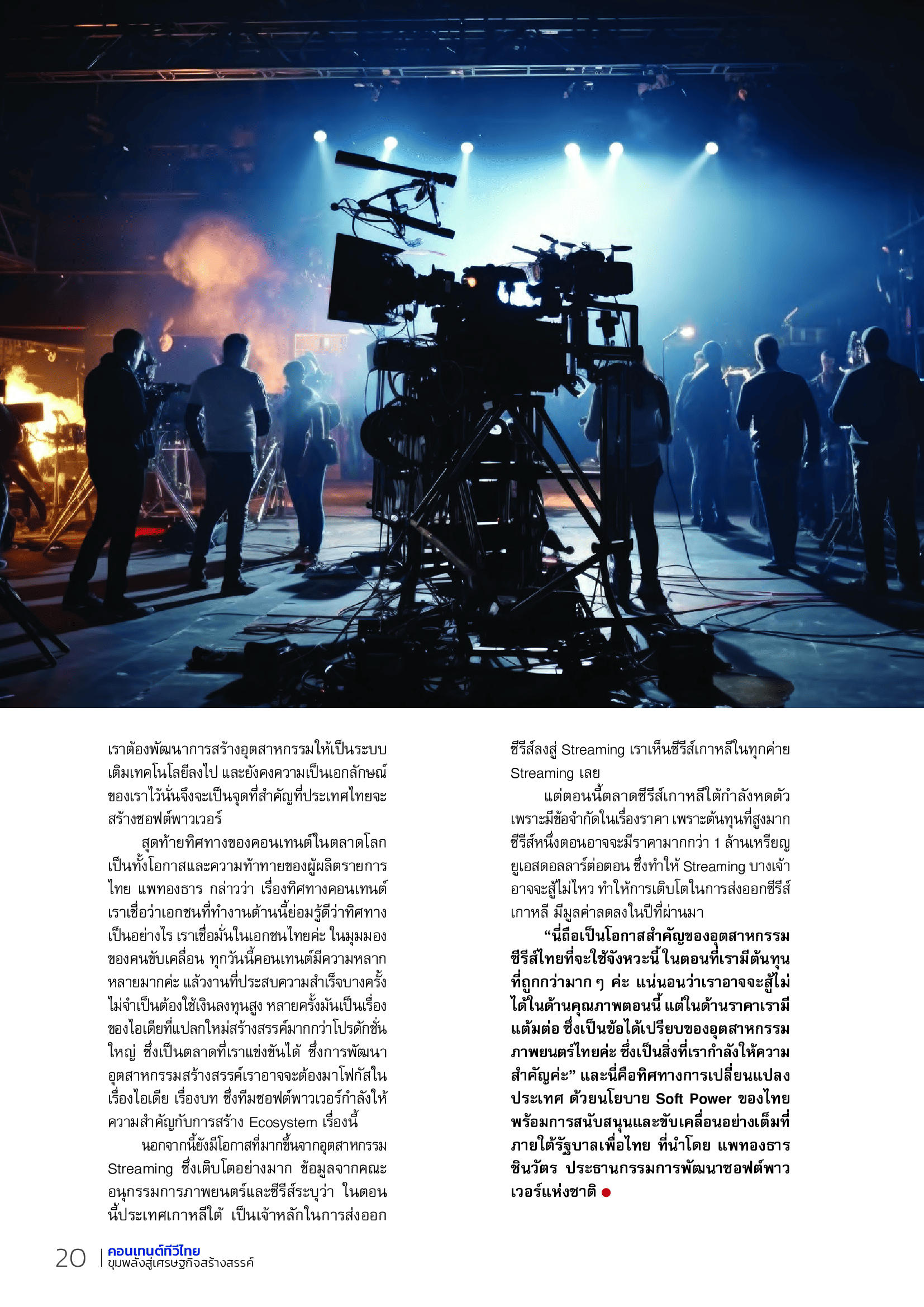 “นี่ถือเป็นโอกาสสำคัญของอุตสาหกรรมซีรีส์ไทยที่จะใช้จังหวะนี้ ในตอนที่เรามีต้นทุนที่ถูกกว่ามากๆ ค่ะ แน่นอนว่าเราอาจจะสู้ไม่ได้ในด้านคุณภาพตอนนี้ แต่ในด้านราคาเรามีแต้มต่อ ซึ่งเป็นข้อได้เปรียบของอุตสาหกรรมภาพยนตร์ไทยค่ะ ซึ่งเป็นสิ่งที่เรากำลังให้ความสำคัญค่ะ” และนี่คือทิศทางการเปลี่ยนแปลงประเทศ ด้วยนโยบาย Soft Power ของไทย พร้อมการสนับสนุนและขับเคลื่อนอย่างเต็มที่ภายใต้รัฐบาลเพื่อไทย ที่นำโดย แพทองธาร ชินวัตร ประธานกรรมการพัฒนาซอฟต์พาวเวอร์แห่งชาติ"
