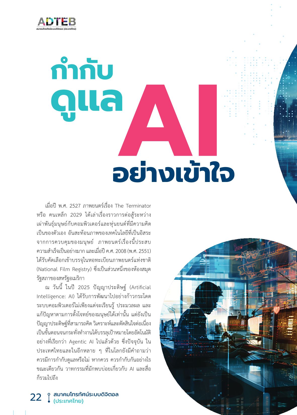 ณ วันนี้ ในปี 2025 ปัญญาประดิษฐ์ (Artificial Intelligence: AI) ได้รับการพัฒนาไปอย่างก้าวกระโดด ระบบคอมพิวเตอร์ไม่เพียงแต่จะเรียนรู้ ประมวลผล และแก้ปัญหาตามการตั้งโจทย์ของมนุษย์ได้เท่านั้น แต่ยังเป็นปัญญาประดิษฐ์ที่สามารถคิด วิเคราะห์และตัดสินใจต่อเนื่องเป็นขั้นตอนจนกระทั่งทำงานได้บรรลุเป้าหมายโดยอัตโนมัติอย่างที่เรียกว่า Agentic AI ไปแล้วด้วย ซึ่งปัจจุบัน ในประเทศไทยและในอีกหลาย ๆ ที่ในโลกยังมีคำถามว่า ควรมีการกำกับดูแลหรือไม่ หากควร ควรกำกับกันอย่างไร ขณะเดียวกัน วาทกรรมที่มักพบบ่อยเกี่ยวกับ AI และสื่อก็รวมไปถึงในช่วงเวลาที่ Generative AI เข้ามาช่วยเพิ่มผลิตภาพและเสริมศักยภาพให้อุตสาหกรรมสื่อ ศิลปินและผู้ผลิตเนื้อหาก็ต้องใช้ศักยภาพและความคิดสร้างสรรค์มากขึ้น