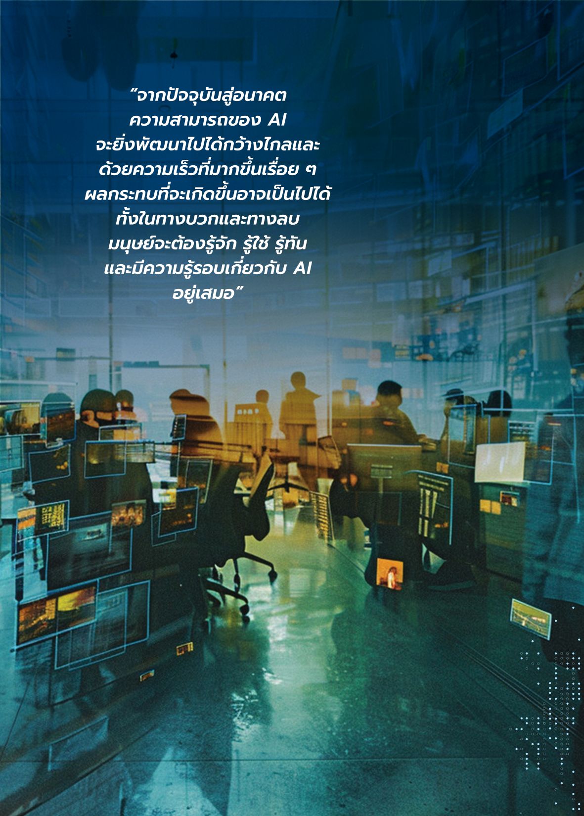 จากปัจจุบันสู่อนาคต ความสามารถของ AI จะยิ่งพัฒนาไปได้กว้างไกลและด้วยความเร็วที่มากขึ้นเรื่อย ๆ ผลกระทบที่จะเกิดขึ้นอาจเป็นไปได้ทั้งในทางบวกและทางลบ มนุษย์จะต้องรู้จัก รู้ใช้ รู้ทัน และมีความรู้รอบเกี่ยวกับ AI อยู่เสมอ ให้ความสำคัญทั้งในด้านนวัตกรรม ความปลอดภัย และไม่ทิ้งใครไว้ข้างหลังดังที่กล่าวมาแล้ว ทั้งนี้ สิ่งที่ไม่อาจหลงลืมหรือลดทอนคุณค่าลงไปได้ก็คือคุณธรรม จริยธรรม ที่จะรักษาและดำรงความเป็นมนุษย์เอาไว้ไม่ให้ถูกทำลาย ในขณะเดียวกัน องค์กรภาครัฐที่เกี่ยวข้องและเป็นตัวแทนโดยชอบของประชาชนก็พึงจะต้องทำหน้าที่ทั้งในการกำกับดูแล การส่งเสริมและการศึกษาวิจัยด้วยความรับผิดชอบเพื่อรังสรรค์ให้ AI พัฒนาไปพร้อม ๆ กับมนุษยชาติอย่างยั่งยืน