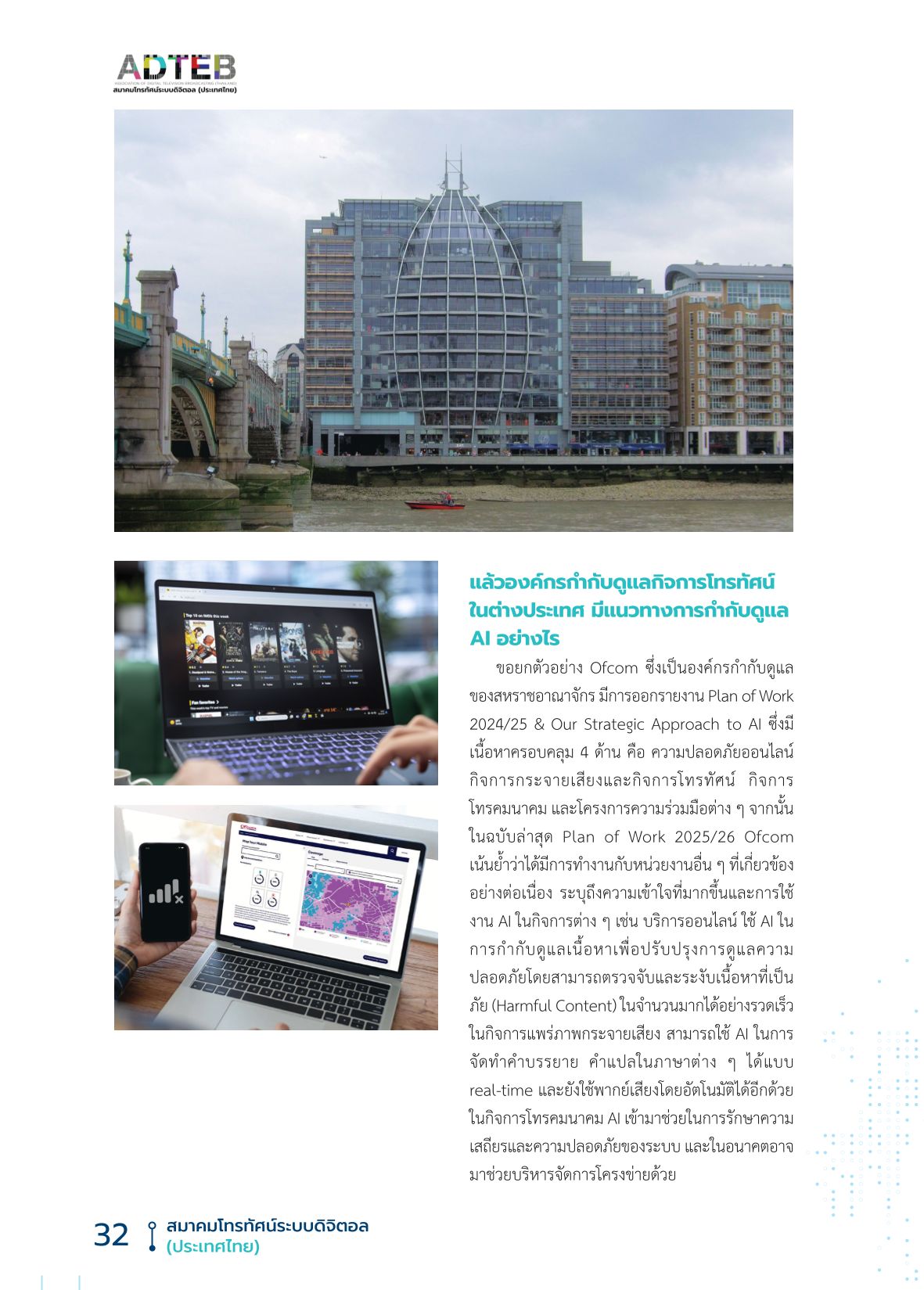 ขอยกตัวอย่าง Ofcom ซึ่งเป็นองค์กรกำกับดูแลของสหราชอาณาจักร มีการออกรายงาน Plan of Work 2024/25 & Our Strategic Approach to AI ซึ่งมีเนื้อหาครอบคลุม 4 ด้าน คือ ความปลอดภัยออนไลน์ กิจการกระจายเสียงและกิจการโทรทัศน์ กิจการโทรคมนาคม และโครงการความร่วมมือต่าง ๆ จากนั้นในฉบับล่าสุด Plan of Work 2025/26 Ofcom เน้นย้ำว่าได้มีการทำงานกับหน่วยงานอื่น ๆ ที่เกี่ยวข้องอย่างต่อเนื่อง ระบุถึงความเข้าใจที่มากขึ้นและการใช้งาน AI ในกิจการต่าง ๆ เช่น บริการออนไลน์ ใช้ AI ในการกำกับดูแลเนื้อหาเพื่อปรับปรุงการดูแลความปลอดภัยโดยสามารถตรวจจับและระงับเนื้อหาที่เป็นภัย (harmful content) ในจำนวนมากได้อย่างรวดเร็ว ในกิจการแพร่ภาพกระจายเสียง สามารถใช้ AI ในการจัดทำคำบรรยาย คำแปลในภาษาต่าง ๆ ได้แบบ real-time และยังใช้พากย์เสียงโดยอัตโนมัติได้อีกด้วย ในกิจการโทรคมนาคม AI เข้ามาช่วยในการรักษาความเสถียรและความปลอดภัยของระบบ และในอนาคตอาจมาช่วยบริหารจัดการโครงข่ายด้วย