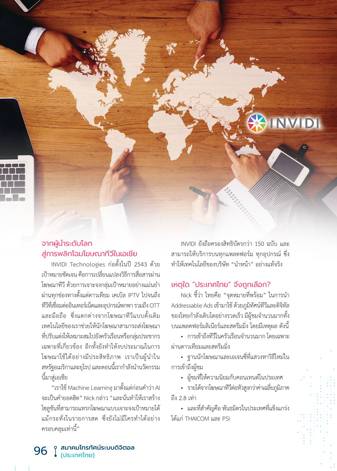 INVIDI Technologies ก่อตั้งในปี 2543 ด้วยเป้าหมายชัดเจน คือการเปลี่ยนแปลงวิธีการสื่อสารผ่านโฆษณาทีวี ด้วยการเจาะจงกลุ่มเป้าหมายอย่างแม่นยำ ผ่านทุกช่องทางตั้งแต่ดาวเทียม เคเบิล IPTV ไปจนถึงทีวีที่เชื่อมต่ออินเทอร์เน็ตและอุปกรณ์พกพา รวมถึง OTT และมือถือ ซึ่งแตกต่างจากโฆษณาทีวีแบบดั้งเดิม เทคโนโลยีของเราช่วยให้นักโฆษณาสามารถส่งโฆษณาที่ปรับแต่งให้เหมาะสมไปยังครัวเรือนหรือกลุ่มประชากรเฉพาะที่เกี่ยวข้อง อีกทั้งยังทำให้งบประมาณในการโฆษณาใช้ได้อย่างมีประสิทธิภาพ เราเป็นผู้นำในสหรัฐอเมริกาและยุโรป และตอนนี้เรากำลังนำนวัตกรรมนี้มาสู่เอเชีย