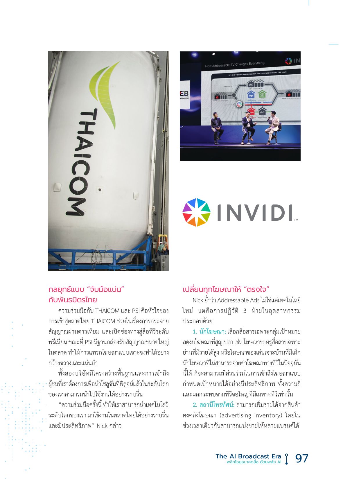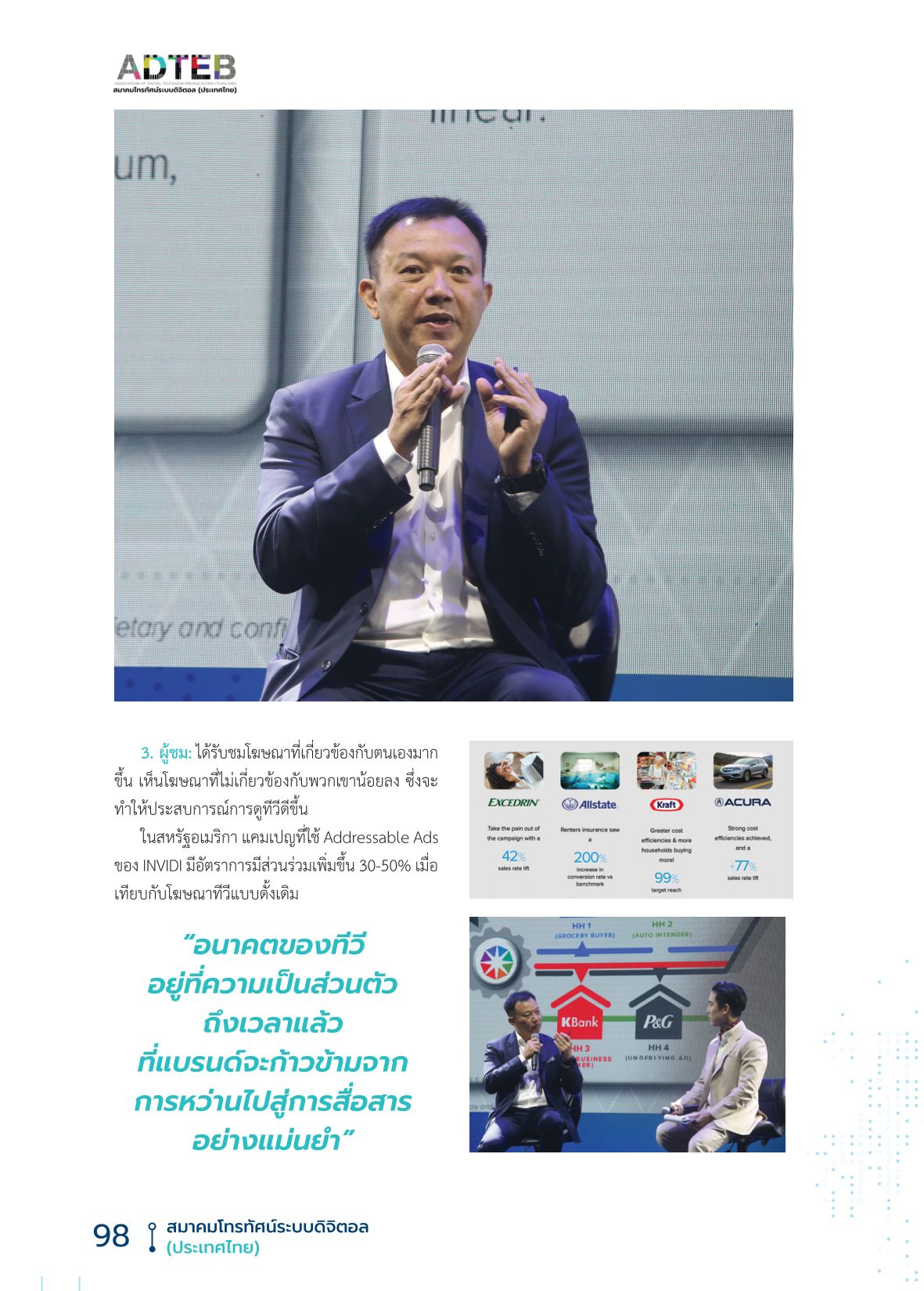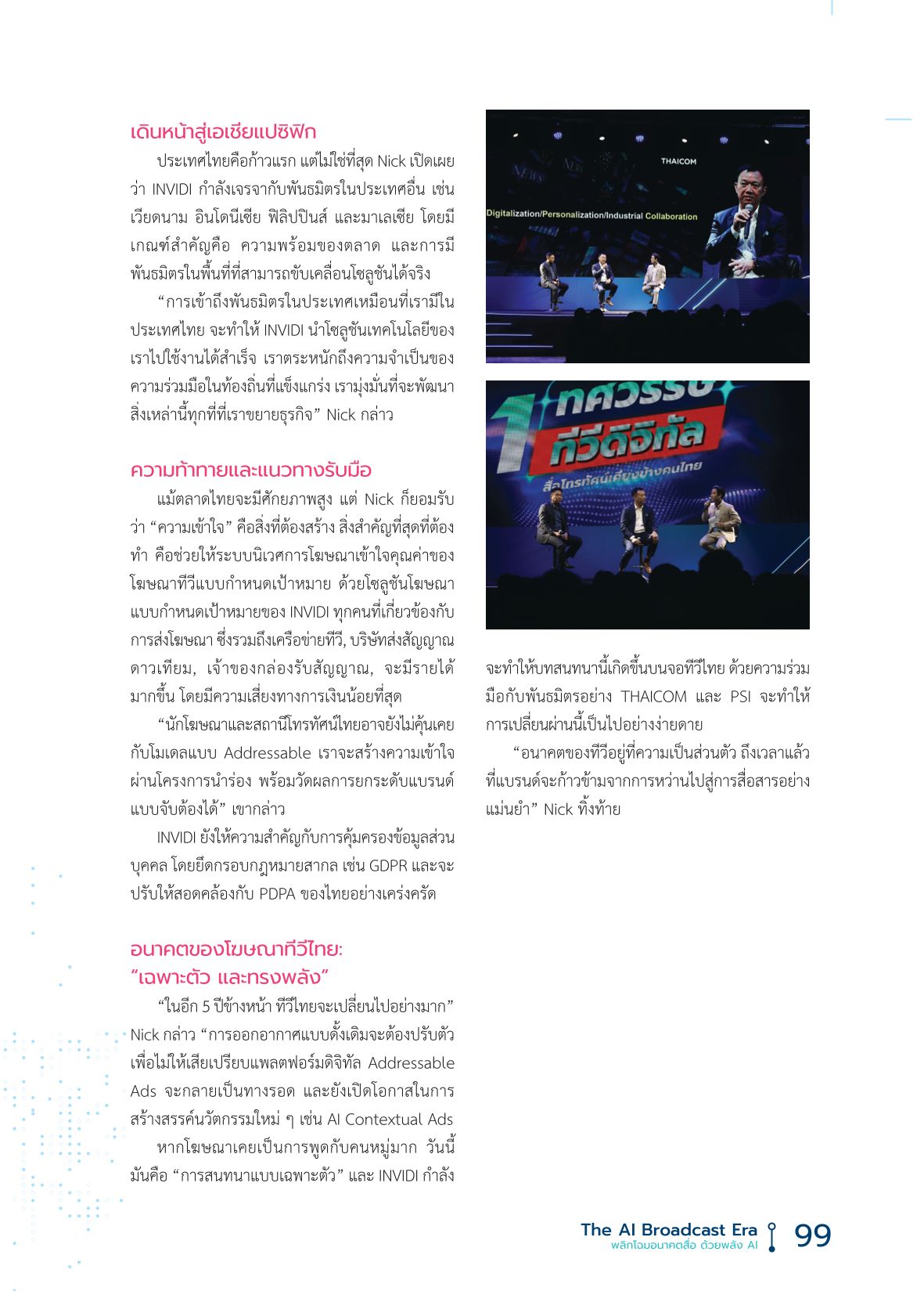 “ในอีก 5 ปีข้างหน้า ทีวีไทยจะเปลี่ยนไปอย่างมาก” Nick กล่าว “การออกอากาศแบบดั้งเดิมจะต้องปรับตัว เพื่อไม่ให้เสียเปรียบแพลตฟอร์มดิจิทัล Addressable Ads จะกลายเป็นทางรอด และยังเปิดโอกาสในการสร้างสรรค์นวัตกรรมใหม่ ๆ เช่น AI Contextual Ads
