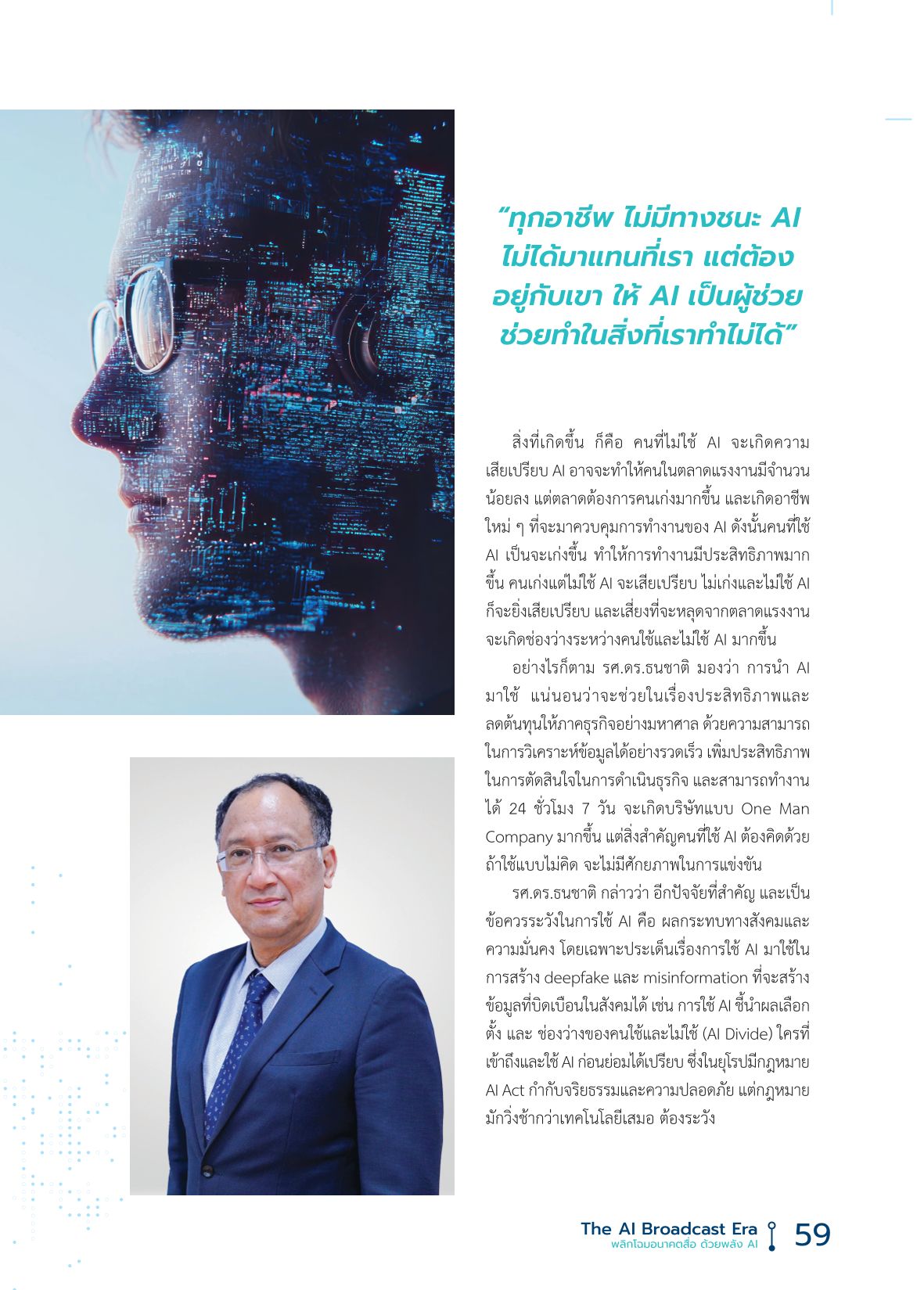 “ทุกอาชีพ ไม่มีทางชนะ AI ไม่ได้มาแทนที่เรา แต่ต้องอยู่กับเขา ให้ AI เป็นผู้ช่วย ช่วยทำในสิ่งที่เราทำไม่ได้ ช่วยเพิ่มศักยภาพการแข่งขัน เหมือนวันที่เรามีรถยนต์ มนุษย์ไม่มีทางวิ่งเร็วกว่ารถ ดังนั้นอยู่กับมัน เช่นเดียวกับ AI แต่ในระยะยาว ก็มีความเสี่ยงอันหนึ่ง ถ้า AI เก่งเกินกว่ามนุษย์ หรือ AGI อาจจะทำให้เกิดการว่างงานครั้งใหญ่ ความกังวลดังกล่าว ทำให้ Geoffrey Hinton ผู้บุกเบิก AI เริ่มคิดถึงการหยุด AI เพราะความเก่งจนน่ากลัวของ AI” รศ.ดร.ธนชาติกล่าวทิ้งท้าย