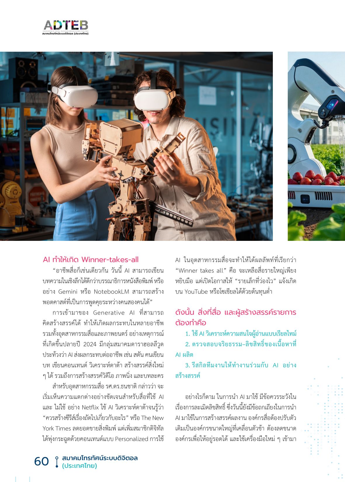 “อาชีพสื่อก็เช่นเดียวกัน วันนี้ AI สามารถเขียนบทความในเชิงลึกได้ดีกว่าบรรณาธิการหนังสือพิมพ์ หรืออย่าง Gemini หรือ NotebookLM สามารถสร้างพอตคาสต์ที่เป็นการพูดคุยระหว่างคนสองคนได้”