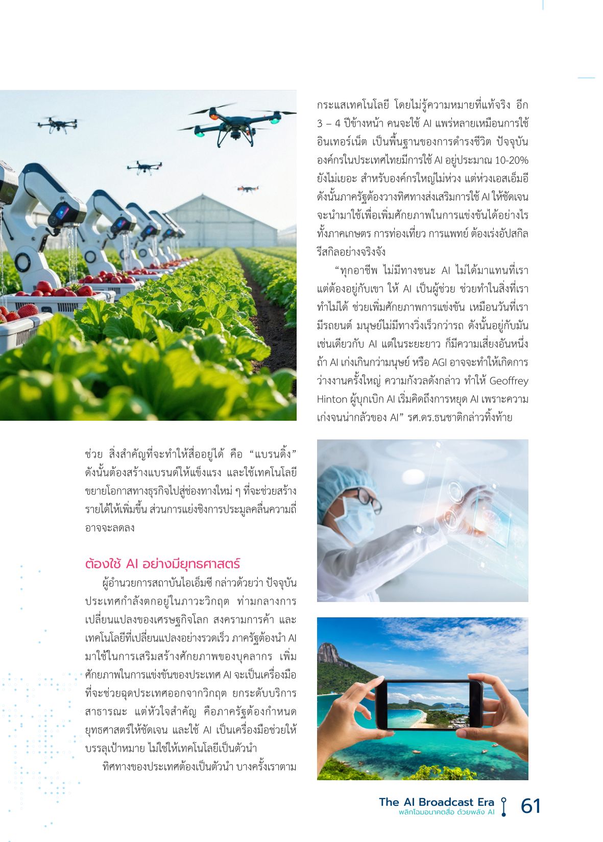 ทิศทางของประเทศต้องเป็นตัวนำ บางครั้งเราตามกระแสเทคโนโลยี โดยไม่รู้ความหมายที่แท้จริง อีก 3 – 4 ปีข้างหน้า คนจะใช้ AI แพร่หลายเหมือนการใช้อินเทอร์เน็ต เป็นพื้นฐานของการดำรงชีวิต ปัจจุบันองค์กรในประเทศไทยมีการใช้ AI อยู่ประมาณ 10-20% ยังไม่เยอะ สำหรับองค์กรใหญ่ไม่ห่วง แต่ห่วงเอสเอ็มอี ดังนั้นภาครัฐต้องวางทิศทางส่งเสริมการใช้ AI ให้ชัดเจน จะนำมาใช้เพื่อเพิ่มศักยภาพในการแข่งขันได้อย่างไร ทั้งภาคเกษตร การท่องเที่ยว การแพทย์ ต้องเร่งอัปสกิล รีสกิลอย่างจริงจัง
