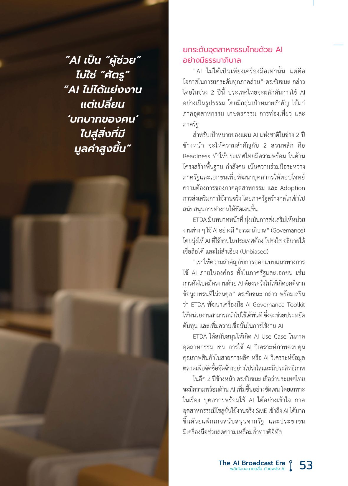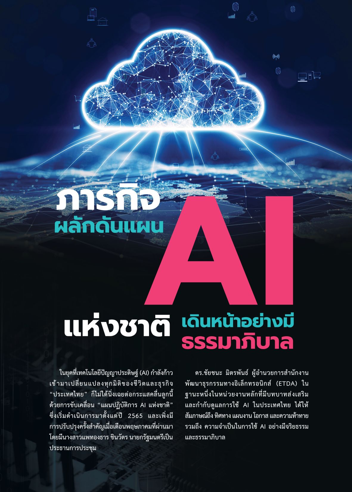 ดร.ชัยชนะ มิตรพันธ์ ผู้อำนวยการสำนักงานพัฒนาธุรกรรมทางอิเล็กทรอนิกส์ (ETDA) ในฐานะหนึ่งในหน่วยงานหลักที่มีบทบาทส่งเสริมและกำกับดูแลการใช้ AI ในประเทศไทย ได้ให้สัมภาษณ์ถึง ทิศทาง แผนงาน โอกาส และความท้าทาย รวมถึง ความจำเป็นในการใช้ AI อย่างมีจริยธรรมและธรรมาภิบาล