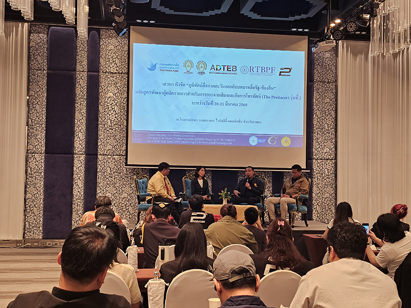 เมื่อวันเสาร์ที่ 21 มีนาคม 2569 คุณชวรงค์ ลิมป์ปัทมปาณี ผู้จัดการหลักสูตร คุณอัญชนก แข็งแรง กรรมการหลักสูตร และคุณธิติพร จุติมานนท์ กรรมการหลักสูตร และคณะผู้เข้าอบรมหลักสูตรพัฒนาผู้ผลิตรายการสำหรับกิจการกระจายเสียงและกิจการโทรทัศน์ (The Producer) รุ่นที่ 2 ร่วมฟังเสวนา หัวข้อ “ภูมิทัศน์สื่อภาคตะวันออกกับบทบาทสื่อรัฐ-ท้องถิ่น” ในโอกาสศึกษาดูงานส่วนภูมิภาค ครั้งที่ 1 ณ โรงแรมอักษร ระยอง เดอะ ไวทัลลิตี้ คอลเล็คชั่น ที่ผ่านมา