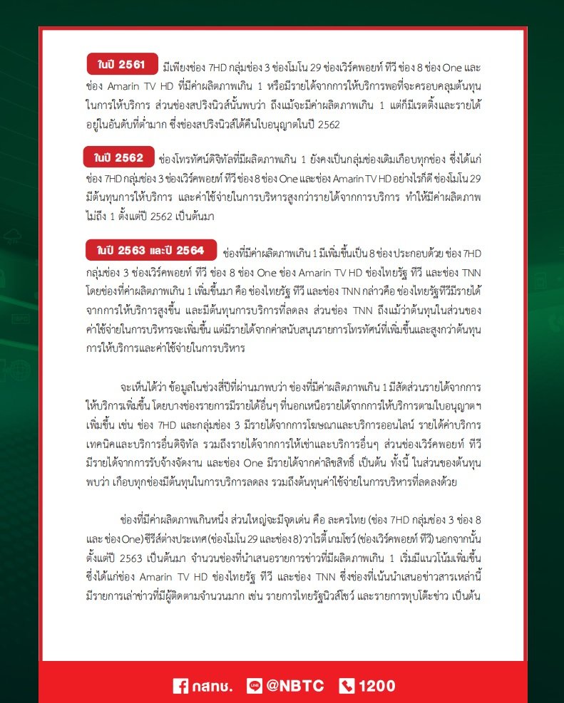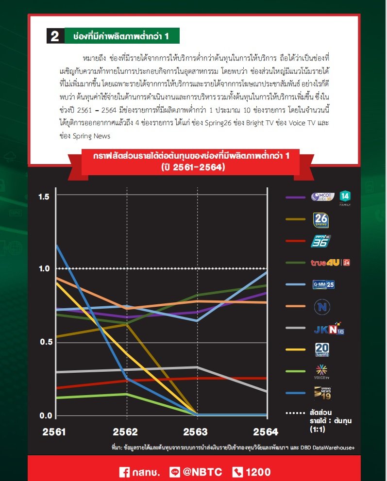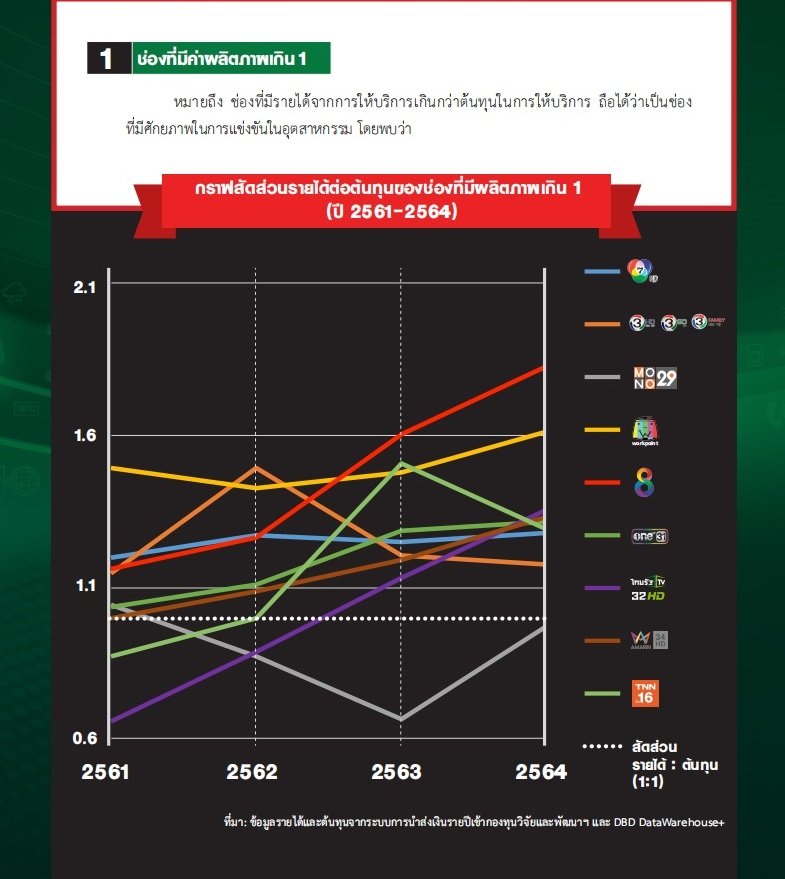 อย่างไรก็ดี ผลิตภาพของช่องภายหลังการเปลี่ยนแปลงก็ยังไม่สามารถถึงจุดคุ้มทุนได้ ส่วนช่องรายการอื่นๆ ที่มีผลิตภาพต่ำกว่า 1 ได้แก่ ช่อง PPTV ที่มุ่งเน้นการถ่ายทอดสดรายการกีฬา ช่อง GMM 25 ที่เน้นรายการละคร และช่อง TRUE4U ที่เน้นการออกอากาศซีรีส์และภาพยนตร์เป็นหลัก การแข่งขันในตลาดกิจการโทรทัศน์นั้น อาจจะมีทั้งผู้ประกอบการบางรายที่สามารถปรับตัวอยู่รอดได้ และอาจมีบางรายที่อาจจะพบข้อจำกัดในการแข่งขัน ซึ่งข้อมููลรายได้้ของผู้ประกอบการบางรายที่มีรายได้จากบริการออนไลน์และบริการดิจิทัลอื่นๆเพิ่มขึ้น สะท้อนถึงการปรับตัวของผู้ประกอบการในสภาวะที่มีความท้าทายทางเทคโนโลยี ทั้งนี้ บทบาทของ กสทช. ในฐานะหน่วยงานการกำกับดูแล อาจไม่ใช่แต่เพียงการสนับสนุุนทางการเงินเพื่อช่่วยให้ผู้ประกอบการทุกรายอยู่รอด แต่สิ่งที่กสทช. พยายามสนับสนุุนและและช่วยเหลือผู้ประกอบการโทรทัศน์คือ การพัฒนาศักยภาพของผู้ประกอบการในรููปแบบต่างๆ ซึ่งรวมไปถึงความพยายามเสนอแนวทางในการแก้ปัญหาเชิงโครงสร้างที่เอื้อให้ผู้ประกอบการปรับตัวได้ดีมากขึ้น เช่น การปรับแก้ไขกฎหมายให้สอดคล้องกับสภาวการณ์์ที่เปลี่ยนแปลงไป