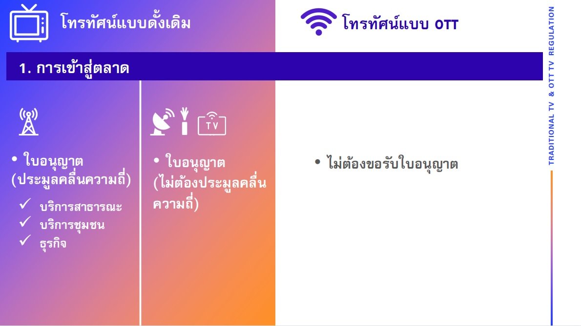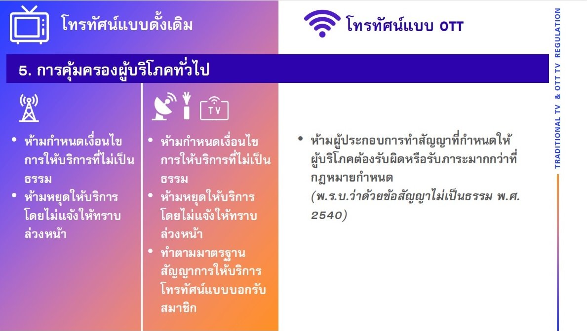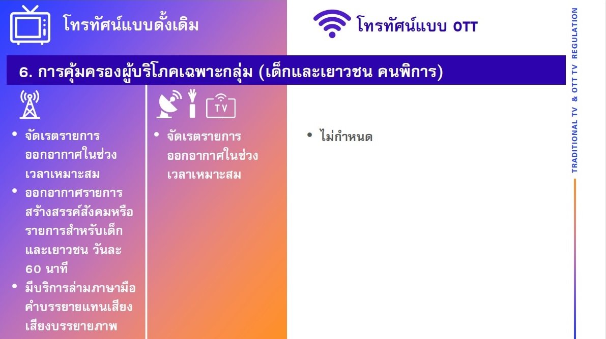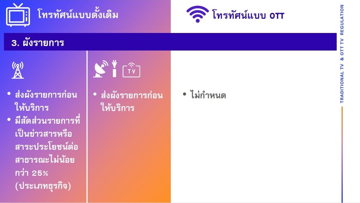 การเปรียบเทียบให้เห็นได้อย่างเข้าใจได้ง่าย ถึงประเด็นการกำกับดูแลกิจการโทรทัศน์ไทย กับ แพลทฟอร์ม OTT เช่น ใบอนุญาต, เนื้อหารายการ, ผังรายการ, โฆษณา, การคุ้มครองผู้บริโภคทั่วไป, การคุ้มครองเด็กและเยาวชน, การแข่งขัน, ค่าธรรมเนียม เป็นต้น