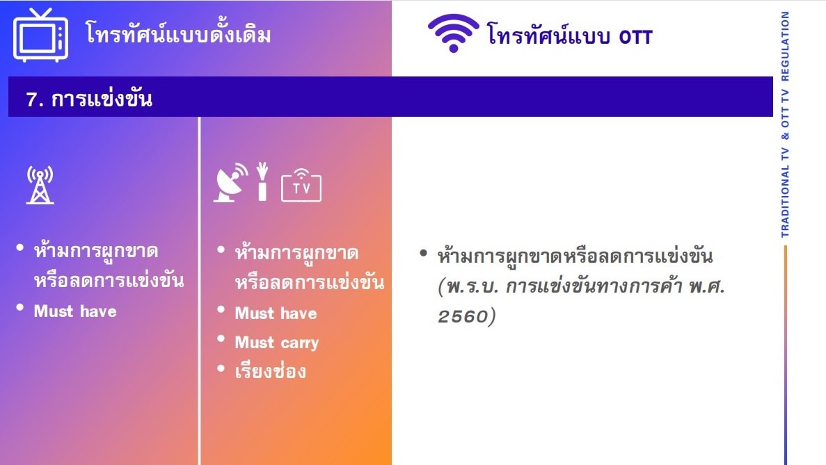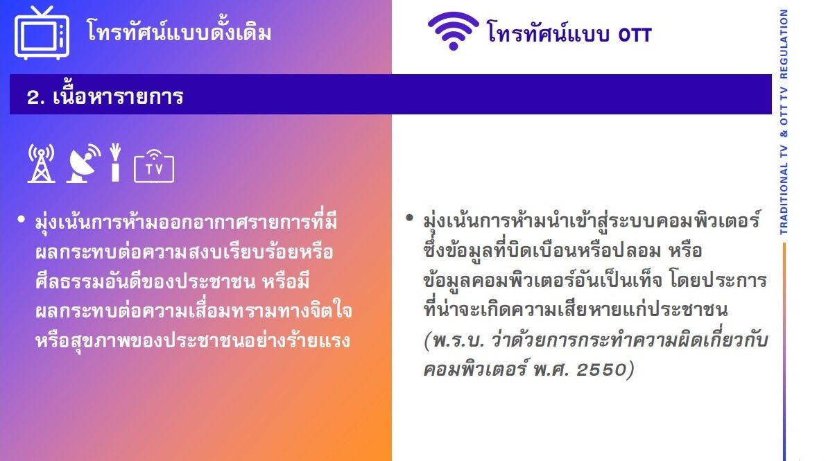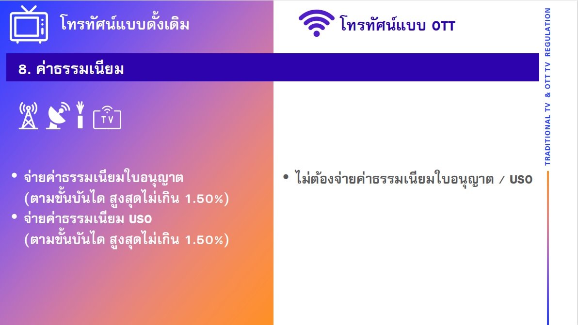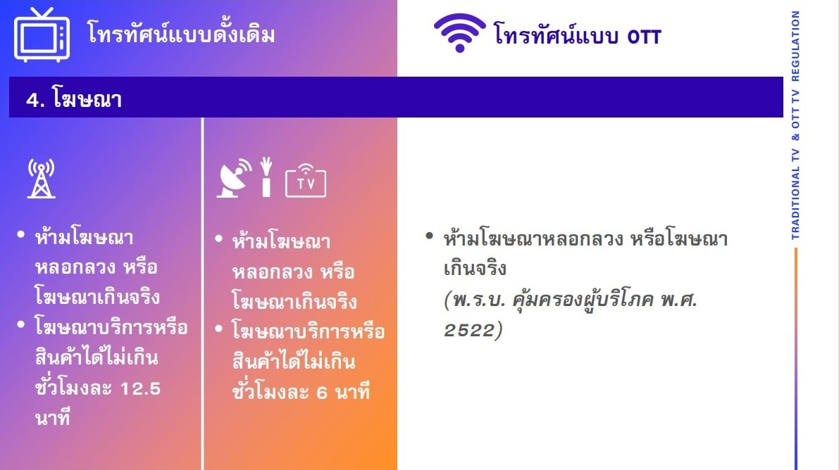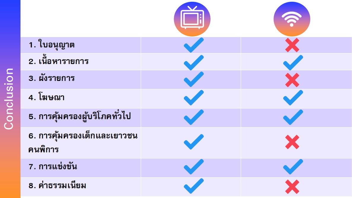 การเปรียบเทียบให้เห็นได้อย่างเข้าใจได้ง่าย ถึงประเด็นการกำกับดูแลกิจการโทรทัศน์ไทย กับ แพลทฟอร์ม OTT เช่น ใบอนุญาต, เนื้อหารายการ, ผังรายการ, โฆษณา, การคุ้มครองผู้บริโภคทั่วไป, การคุ้มครองเด็กและเยาวชน, การแข่งขัน, ค่าธรรมเนียม เป็นต้น